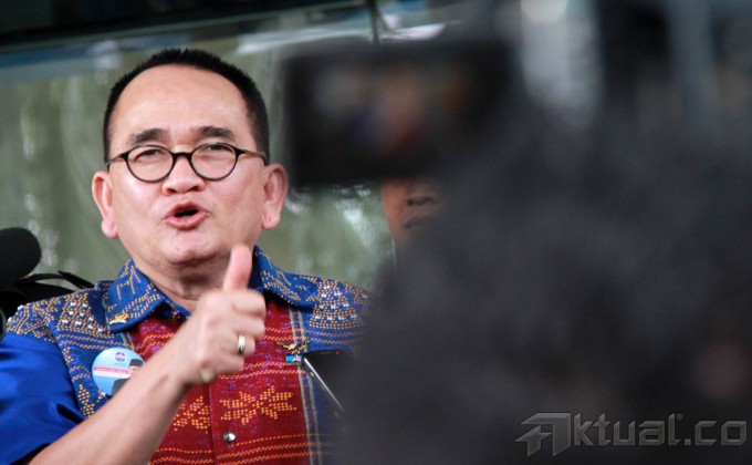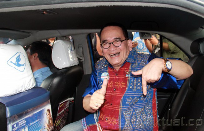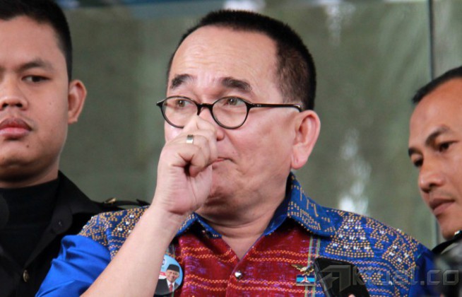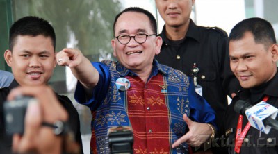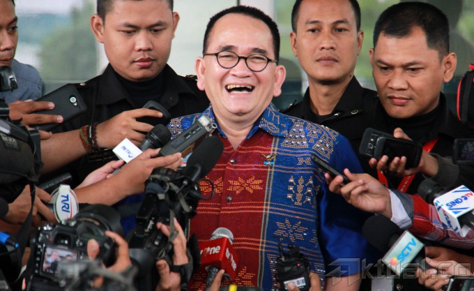 Juru bicara Partai Demokrat, Ruhut Sitompul, ditanya wartawan usai menjalani pemeriksaan di gedung Komisi Pemberantasan Korupsi (KPK), Jakarta, Rabu (12/3/2014). Ruhut diperiksa sebagai saksi atas kasus yang menjerat mantan Ketua Umum DPP Partai Demokrat, Anas Urbaningrum. Selain itu Ruhut sempat melancarkan manuver politiknya dengan mengatakan jika partai terkorup saat ini masih disandang oleh Partai Golkar. Aktual/Tino Oktaviano