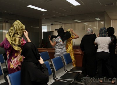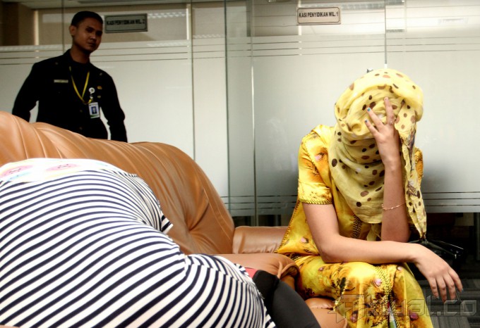 Perempuan asal Maroko yang berfrofesi sebagai psk menutupi wajahnya saat diliput awak media di Gedung Dirjen Imigrasi, Kemenkum HAM, Jakarta, Kamis (11/6/2015). Ditjen Imigrasi berhasil menangkap delapan perempuan asal Maroko saat razia penertiban Keimigrasian dikawasan Puncak Bogor, Jawa Barat. AKTUAL/MUNZIR