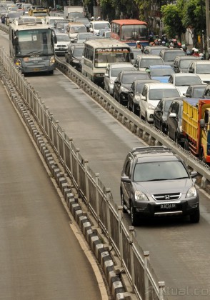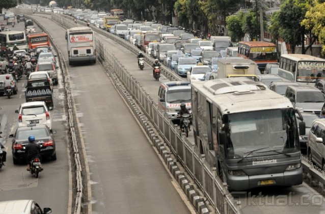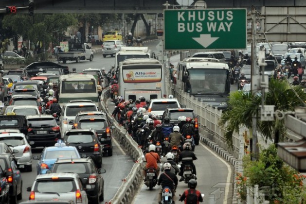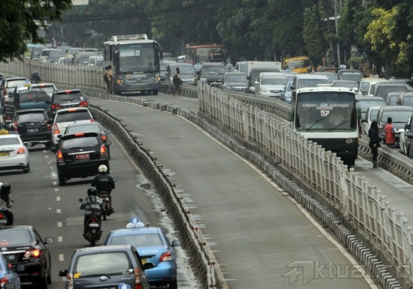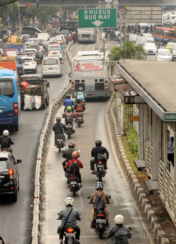 Sejumlah kendaraan memasuki jalur khusus busway di Jalan Mampang Prapatan, Jakarta Selatan, Rabu (30/10/2013). Jajaran Kepolisian Polda Metro Jaya rencananya akan memberlakukan denda maksimal bagi para pengendara yang mencoba memasuki atau menerobos jalur bus TransJakarta. Dalam pasal 287 ayat 1 dan 2 Undang-undang Lalulintas dan Angkutan Jalan No.22/2009 juga disebutkan besaran denda maksimal yaitu Rp1 juta untuk kendaraan roda dua dan Rp 500.000 untuk kendaraan roda dua. Aktual/Tino Oktaviano