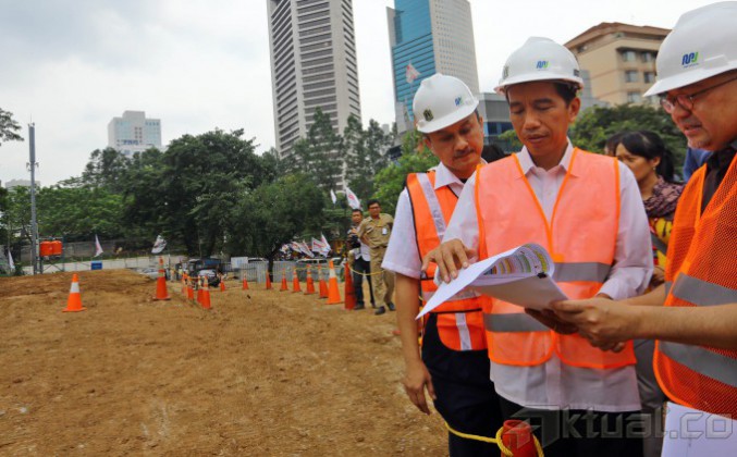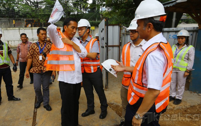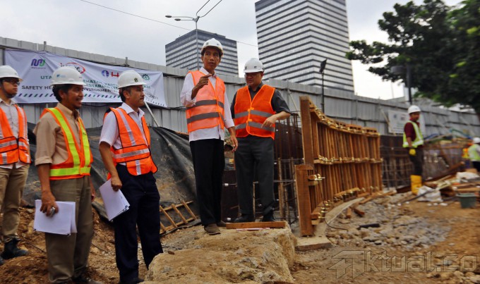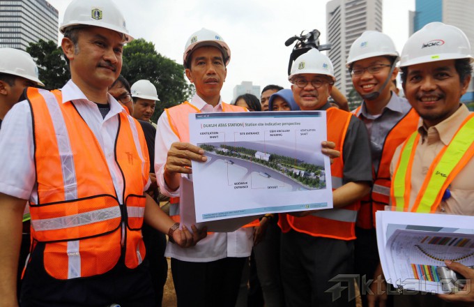 Gubernur DKI Jakarta Joko Widodo, berbincang dengan direksi PT Mass Rapid Transit Jakarta (MRT) saat melakukan inspeksi mendadak (sidak) proyek MRT di kawasan Jalan Sudirman, Jakarta Pusat, Selasa (25/3/2014). Proyek MRT tahap I sepanjang 15,7 Km yang diperkirakan akan selesai hingga Mei 2018 dengan menelan biaya senilai USD1,5 miliar atau sekitar Rp15 trilliun. Aktual/Tino Oktaviano