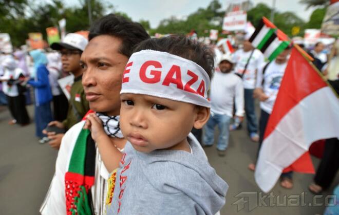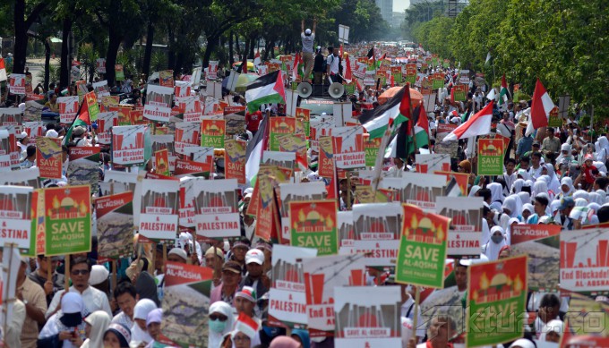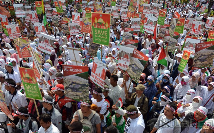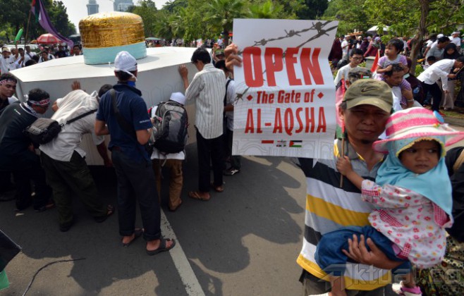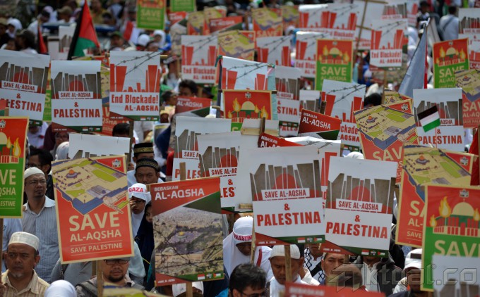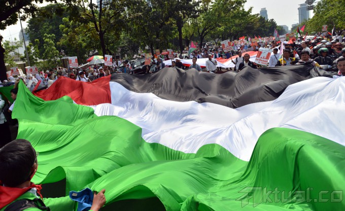 Massa dari Komite Nasional untuk Rakyat Palestina (KNRP) menggelar aksi unjuk rasa yang memadati Jalan Medan Merdeka Selatan, tepatnya di depan Kantor Kedutaan Besar Amerika Serikat, Jakarta, Minggu (16/11/2014). Dalam aksi tersebut, mereka menuntut pembukaan blokade menuju Masjid Al-Aqsa oleh Israel. AKTUAL/TINO OKTAVIANO