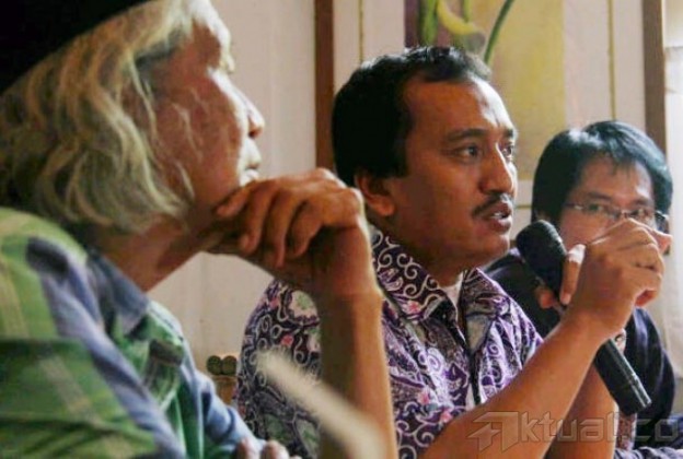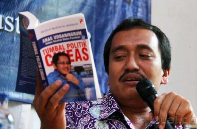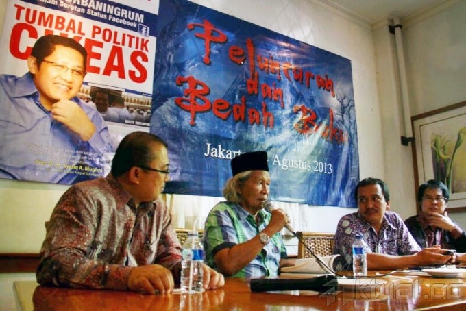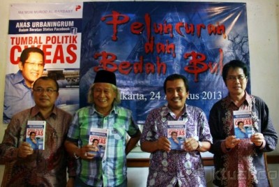 Penulis buku Ma’mun Murod Al-Barbasy (kedua kanan) berfoto bersama usai peluncuran buku ‘Anas Urbaningrum Tumbal Politik Cikeas’ di Warung Daun, Cikini, Jakarta, Jumat (23/8). Buku tersebut membahas proses naiknya Edhie Baskoro Yudhoyono (ibas) menjadi sekjen partai Demokrat dan proses pengaitan AU sebagai tersangka proyek hambalang.Aktual/Oke Dwi Atmaja