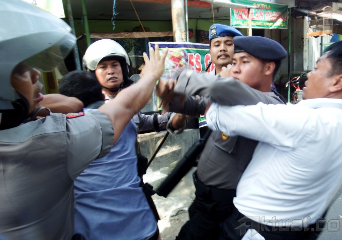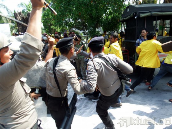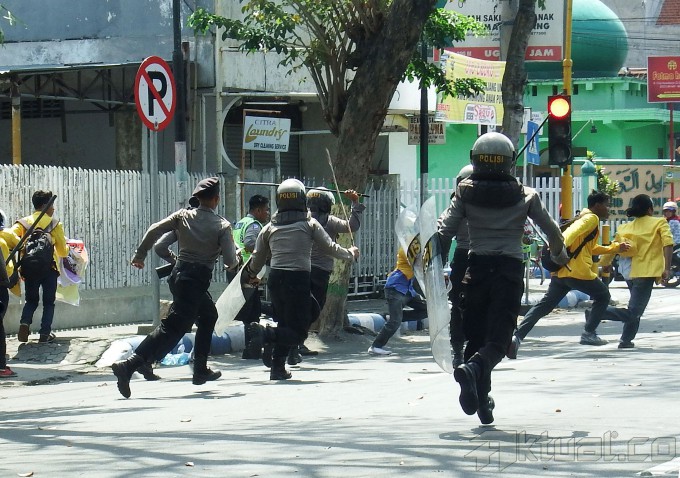 Polisi dan mahasiswa Universitas Darul Ulum terlibat bentrok saat menggelar unjuk rasa di depan Gedung DPRD Kabupaten Jombang, Jawa Timur, Sabtu (30/5). Dalam orasinya mahasiswa memprotes ijazah yang diindikasikan asli tapi palsu’ berdar di kampus mereka. ANTARA FOTO/Syaiful Arif
