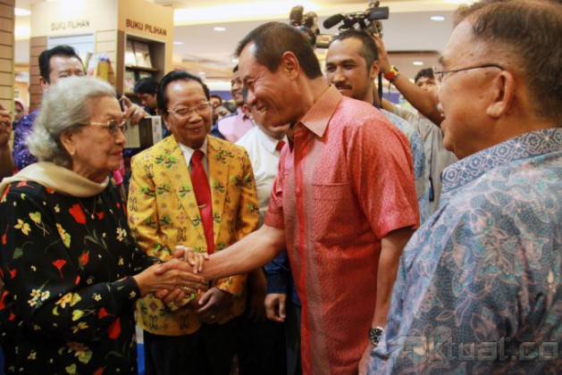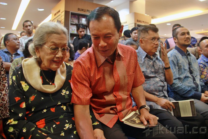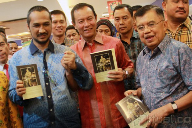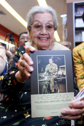 Dari kiri ke kanan, Istri Hoegeng, Merry Roeslan, Ketua KPK Abraham Samad, Kapolri Jenderal Pol Sutarman dan Ketua PMI yang juga mantan Wapres Jusuf Kalla, memperlihatkan buku ‘Hoegeng Polisi dan Menteri Teladan’ saat peluncuran buku di Gramedia, Pondok Indah, Jakarta Selatan, Minggu (17/11/2013). Buku yang ditulis oleh wartawan Kompas, Suhartono ini didedikasikan untuk Almarhum mantan Kapolri Jenderal Hoegeng Imam Santoso yang bercerita tentang kejujuran dan kiprahnya yang patut diteladani. Aktual/Tino Oktaviano