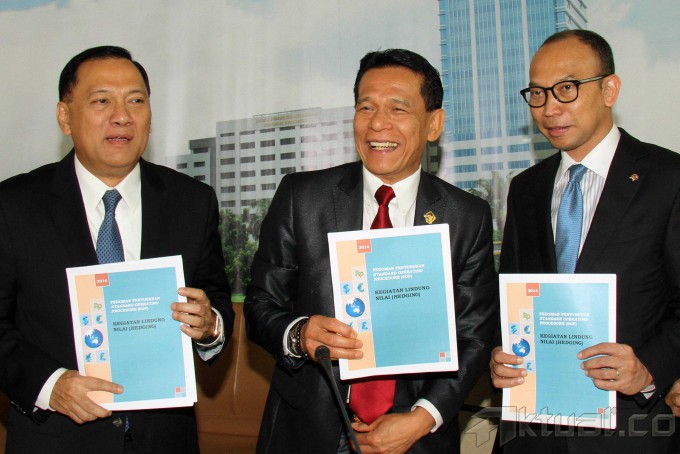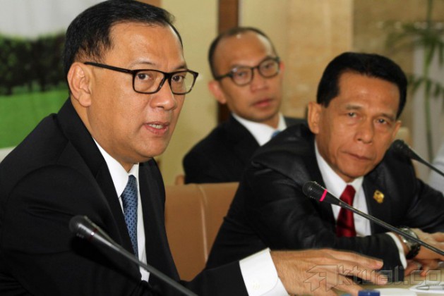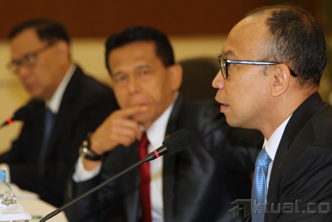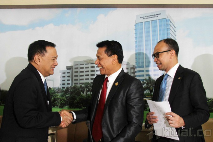 Ketua BPK Rizal Djalil (tengah) bersama Gubernur Bank Indonesia Agus Martowardojo (kiri) menyimak paparan Menteri Keuangan Chatib Basri dalam rapat koordinasi lanjutan tentang nilai lindung (hedging) di Jakarta, Rabu (17/9/2014). Rakor tersebut menyepakati pedoman atau standar operating procedure (SOP) mengenai transaksi lindung nilai (hedging). AKTUAL/TINO OKTAVIANO