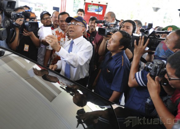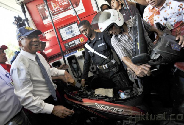 Menteri Energi dan Sumber Daya Mineral (ESDM) Jero Wacik melakukan inspeksi mendadak (sidak) di Stasiun Pengisian Bahan Bakar Umum (SPBU) Jalan Abdul Muis, Jakarta Pusat, Rabu (27/8/2014). Jero didampingi sejumlah petinggi dari kementerian ESDM dan Pertamina. Dalam sidak tersebut Jero sempat menyapa pengguna kendaraan yang sedang mengisi bahan bakar dan memastikan penyaluran BBM bersubsidi lancar. Aktual/Tino Oktaviano