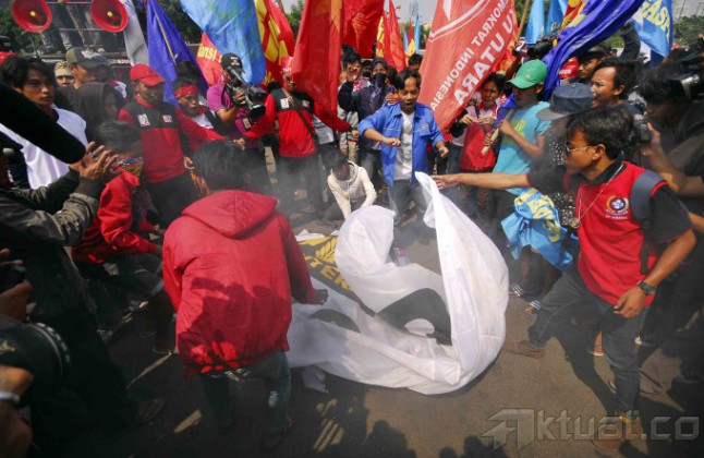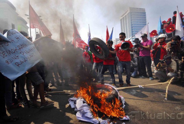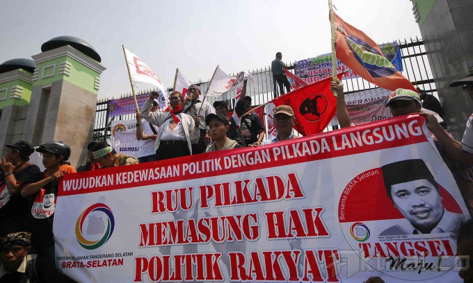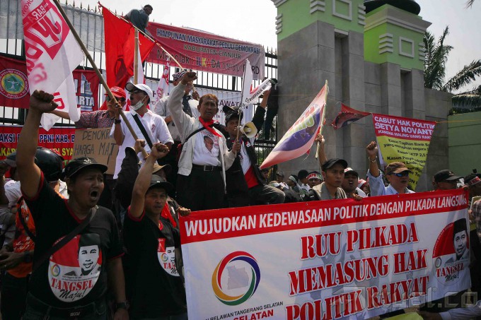 Sejumlah aktivis dari Barisan Relawan Tangsel melakukan aksi damai di depan gedung DPR, Jakarta, Kamis (25/9/2014). Dalam aksi tersebut merek menyerukan penolakan RUU Pilkada karena dinilai memasung HAK politik rakyat.AKTUAL/TINO OKTAVIANO