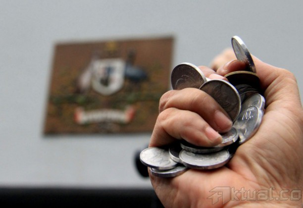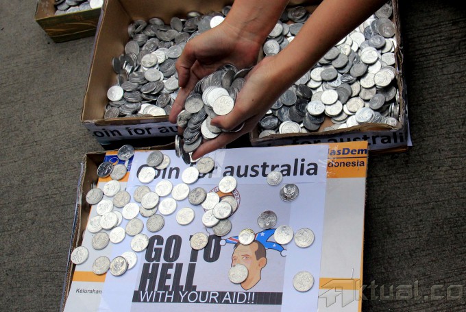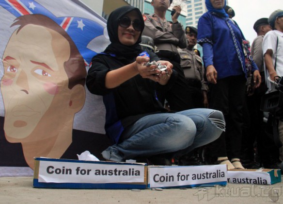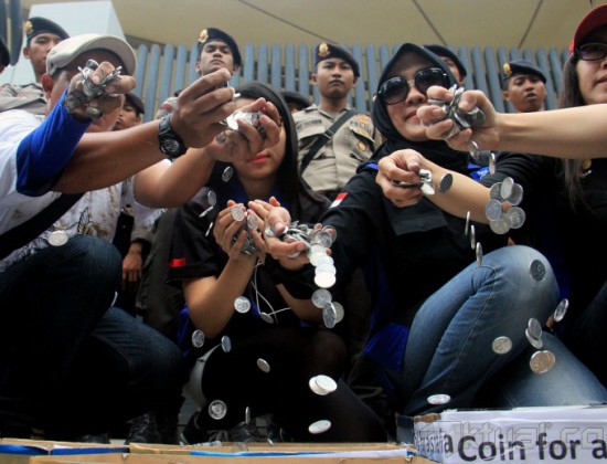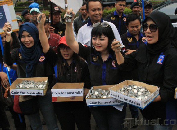Puluhan Garda Pemuda Nasdem menunjukan koin untuk Perdana Menteri Australia Tony Abhout di depan kantor Kedutaan Besar Australia, Jalan HR Rasuna Said, Jakarta Selatan, Jumat (27/2/2015). Aksi ini untuk menyerahkan koin ke Kedutaan Besar Australia. AKTUAL/MUNZIR
