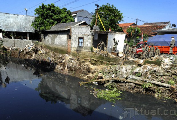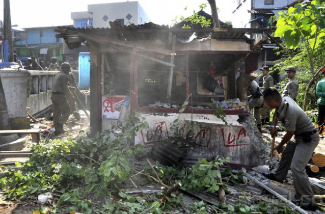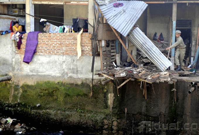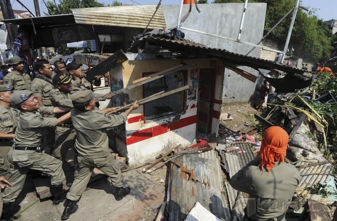 Sejumlah petugas Satpol PP menggunakan kayu menghancurkan atap saat menggelar membongkar bangunan permanen yang berdiri di sempadan Kali Mampang di kawasan Pondok Jaya, Mampang, Jakarta, Senin (18/8/2014). Aktual/Tino Oktaviano