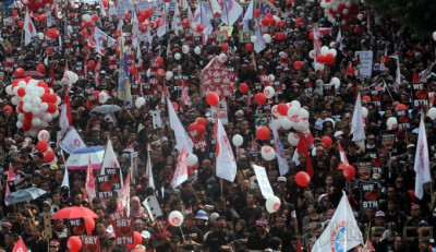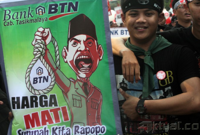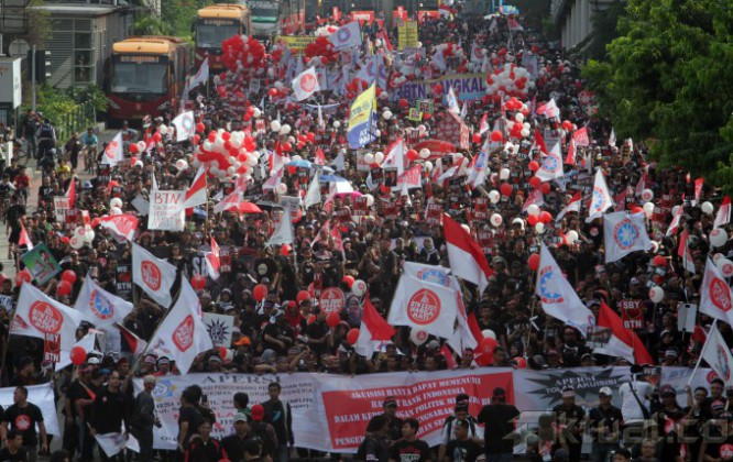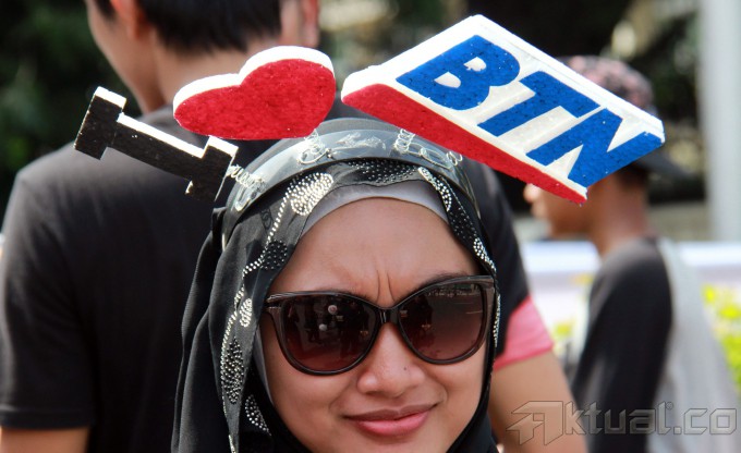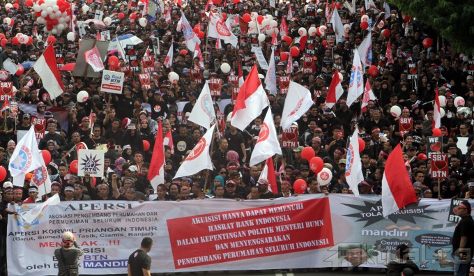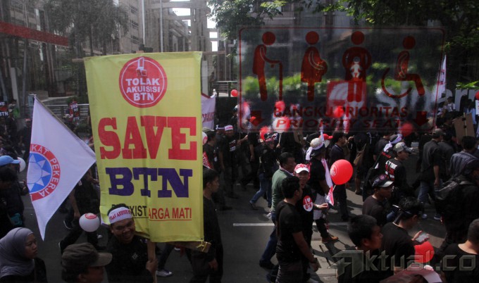 Ribuan karyawan Bank Tabungan Negara (BTN) melakukan longmarch saat unjuk rasa di Bundaran Hotel Indonesia, Jakarta Pusat, Minggu (27/4/2014). Dalam aksi ini, mereka menolak akuisi Bank Mandiri terhadap bank spesialis kredit rumah itu. Karyawan yang tergabung dalam Serikat Karyawan BTN ini membawa spanduk tolak akusisi serta ajakan selamatkan BTN. Salah satu spanduk juga terdapat ucapan terima kasih kepada Presiden Susilo Bambang Yudhoyono yang menolak rencana akuisisi ini. Aktual/Tino Oktaviano