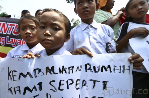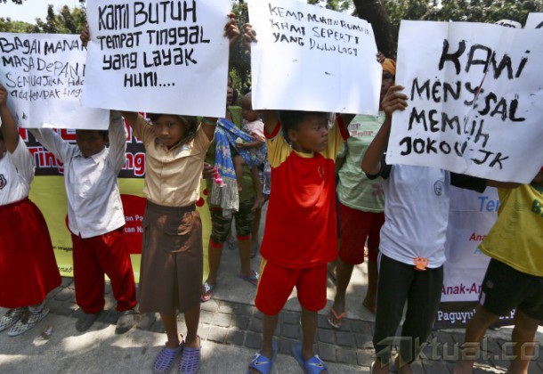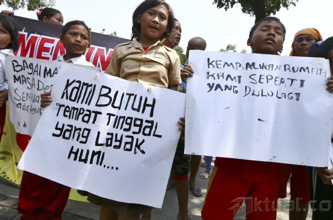 Anak-anak warga korban gusuran Tanah Abang memegang poster saat menggelar aksi unjuk rasa di depan Balai Kota, Jakarta, Senin (22/9/2014). Aksi yang diikuti ratusan warga korban gusuran ini untuk menuntut realisasi rumah susun yang dijanjikan Jokowi. AKTUAL/TINO OKTAVIANO