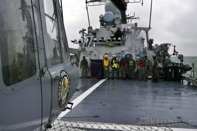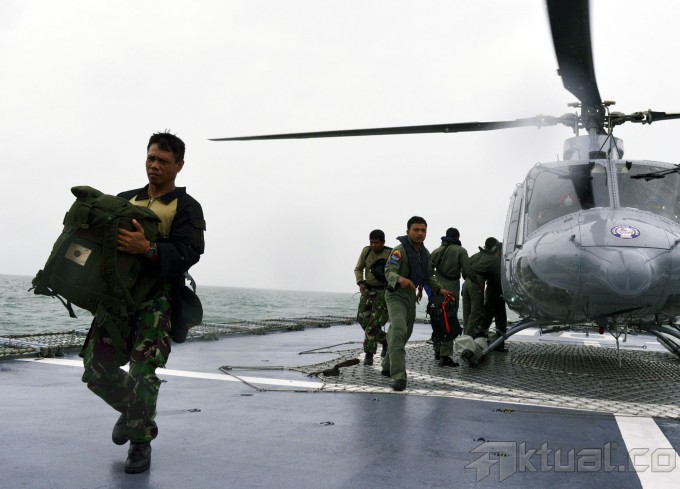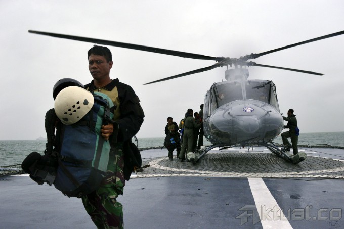Suasana saat penurunan penyelam TNI AL dari Helikopter Bell 412 ke KRI Bung Tomo di perairan Teluk Kumai, Pangkalanbun, Kalimantan Tengah, Kamis (1/1/2015) Tim penyelam TNI AL ini rencananya akan melakukan pencarian AirAsia QZ8501 di bawah laut jika cuaca mulai membaik. AKTUAL/Ist
