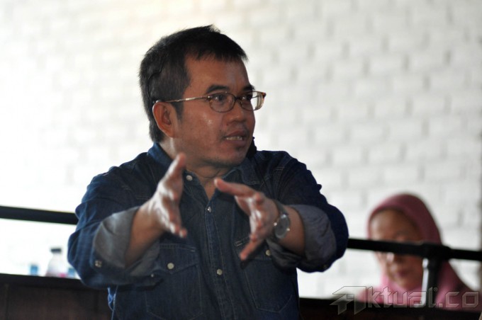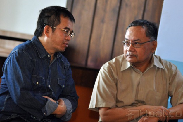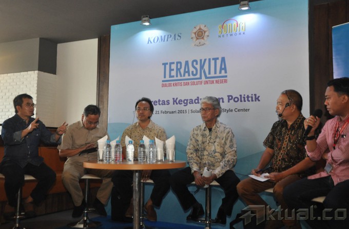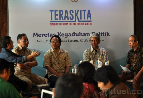 Ketua Pusat Studi Islam dan Kenegaraan Indonesia, Yudi Latief, Direktur Lembaga Penelitian Pendidikan Penerbit Yogyakarta, Ashadi Siregar, Pemred Harian Kompas, Budiman Tanuredjo, Peneliti Senior Lembaga Ilmu Pengetahuan Indonesia, Mochtar Pabotinggi, moderator, Banu Astono dan Anto saat mengisi acara diskusi di Jakarta, Sabtu (21/2/2015). Diskusi tersebut bertema “Meretas Kegaduhan Politik”. AKTUAL/JUNADI MAHBUB