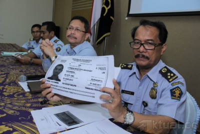 Kepala Kantor Imigrasi (Kakanim) Kelas I Tanjung Perak, Elfinur, menunjukkan salinan passport salah satu warga Surabaya yang hilang di Turki saat jumpa pers di Kantor Imigrasi Kelas I Tanjung Perak jl. Darmo Indah No 21, Surabaya, Jatim, Rabu (11/3). Terkait dengan hilangnya 9 warga Surabaya di Turki, pihak Kantor Imigrasi Kelas I Tanjung Perak memperketat pengurusan pasport tujuan negara di Timur Tengah. ANTARA FOTO/Bima