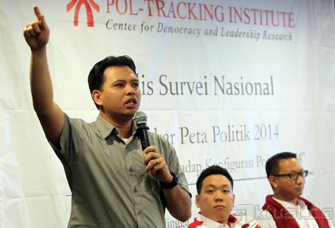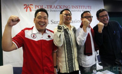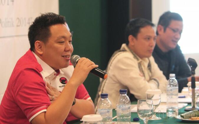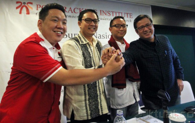 (kiri ke kanan) Politisi PDIP Charles Honoris , Politisi Golkar Charles Bonar Sirait, Politisi Gerindra Aryo Djojohadikusumo dan Politisi Partai Demokrat Didi Irawadi Syamsuddin berjabat tangan bersama usai paparan hasil survey Menakar Peta Politik 2014 -Pengaruh Figur Terhadap Konfigurasi Politik 2014 di Jakarta, Minggu (26/1/2014). Pemilih lebih cenderung menyukai calon presiden laki-laki dengan total 62 persen dan hanya 32 persen yang menyatakan laki-laki/perempuan sama saja dan 2 persen pemilih yang mendorong perempuan sebagai capres. Aktual/Tino Oktaviano