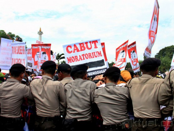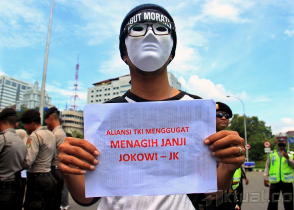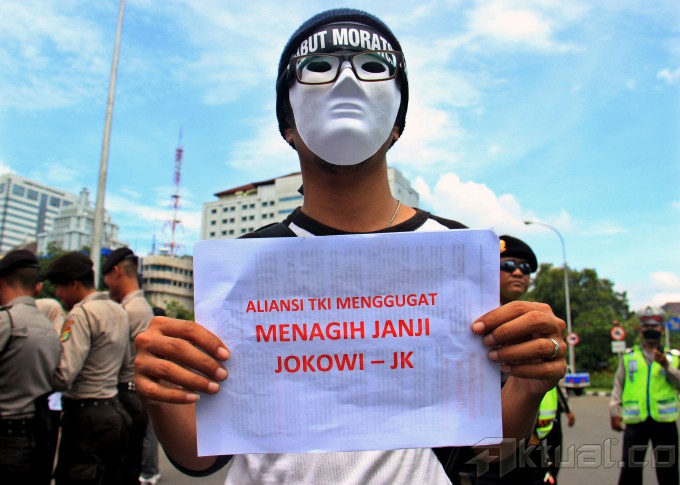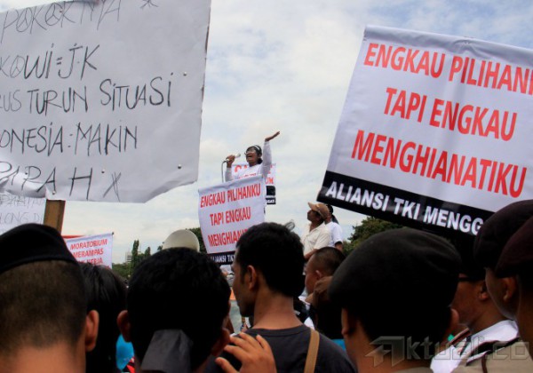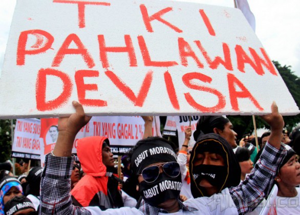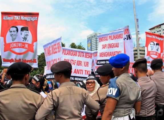 Ratusan tenaga kerja Indonesia yang tergabung dalam Aliansi TKI menggugat melakukan aksi di depan Istana Negara Jakarta, Selasa (7/4/2015). Para TKI memprotes Penerapan moratorium penempatan TKI informal atau sektor rumah tangga ke hampir seluruh negara di Timur Tengah yang berjalan hampir 4 tahun ini menuai kritik dari sejumlah aktivis TKI. AKTUAL/MUNZIR