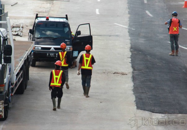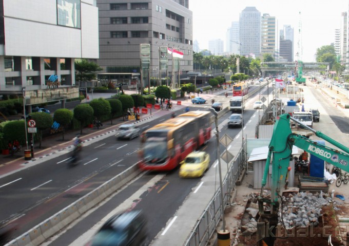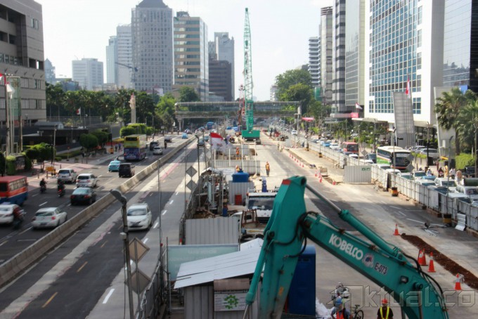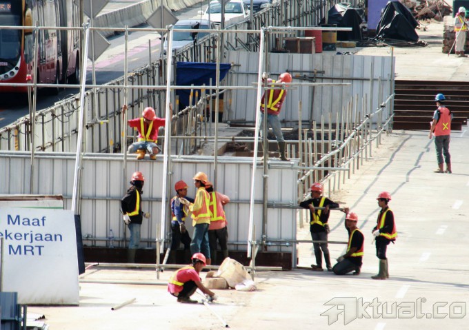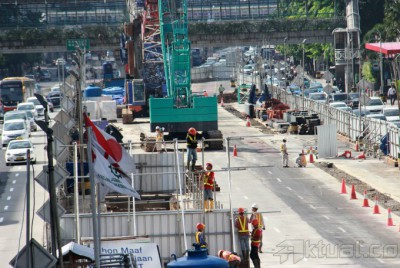 Pekerja mengerjakan proyek Mass Rapid Transit (MRT), di kawasan Jalan MH Thamrin, Jakarta Pusat, Selasa (5/8/2014). Adapun total biaya pembangunan MRT koridor utara-selatan, yaitu Lebak Bulus-Bundaran Hotel Indonesia, mencapai 145 miliar Yen atau setara Rp 16 triliun. Pendanaan tersebut didapatkan dari pinjaman JICA sebesar 125,1 miliar Yen dan sisanya berasal dari PMP Pemprov DKI. Aktual/Tino Oktaviano
