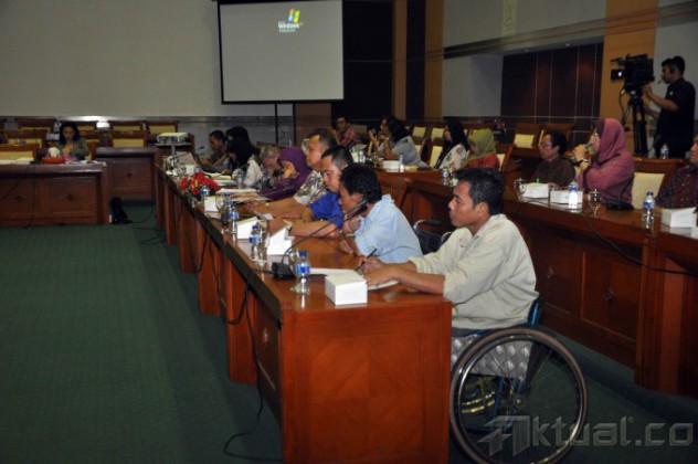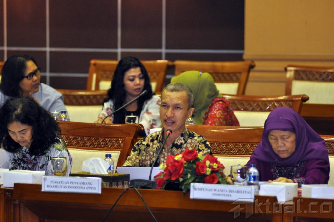 Ketua Persatuan Penyandang Disabilitas Indonesia (PPDI) Gufroni Sakaril dan Ketua Himpunan Wanita Disabilitas Indonesia (HWDI), Maulani A Rotinsulu melakukan Rapat Dengar Pendapat Umum Panja dengan Komisi VII DPR RI di Komplek Parlemen, Senayan, Jakarta, Senin (1/6/2015). RDPU Panja Komisi VIII DPR RI membahas mengenai RUU tentang penyandang disabilitas dan masukan terhadap RUU tersebut. AKTUAL/JUNAIDI MAHBUB
