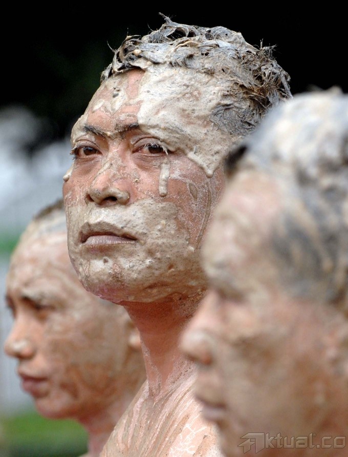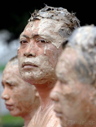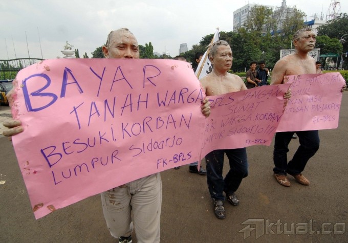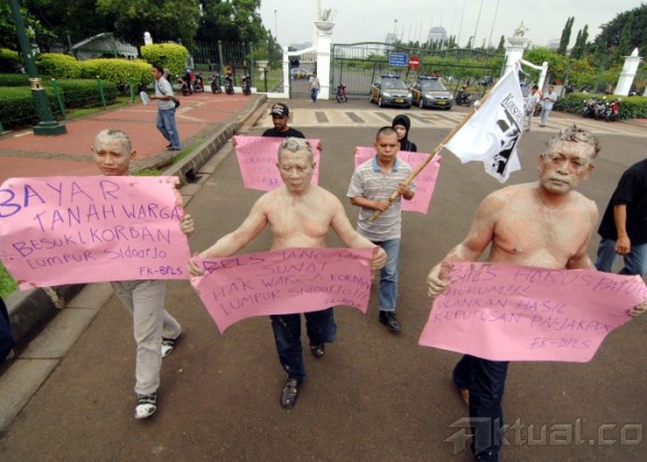 Korban lumpur Lapindo yang tergabung dalam Konsorsium Pembaruan Agraria melakukan aksi unjuk rasa di depan Istana Negara di Jakarta, Selasa (28/5). Dalam aksinya mereka mendesak Presiden Susilo Bambang Yudhoyono untuk memerintahkan BPLS segera menyelesaikan pembayaran jual beli kepada warga korban lumpur Lapindo yang belum dibayarkan sama sekali. Aktual/Tino Oktaviano