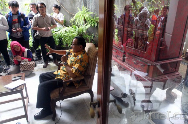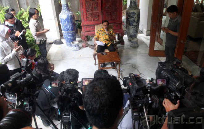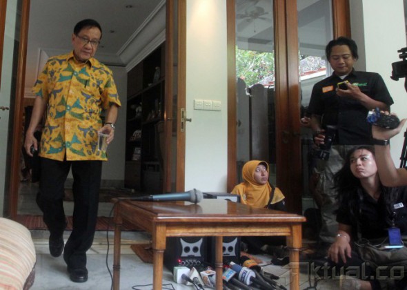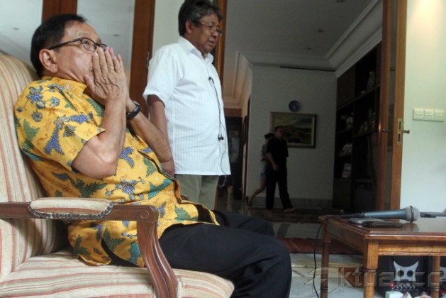 Ketua Dewan Pertimbangan Partai Golkar Akbar Tandjung menyatakan kesiapannya untuk menjadi calon wakil presiden (Cawapres) dari PDI-P maupun Partai Gerindra saat jumpa pers di kediamannya Jalan Punawarman, Kebayoran Baru, Jakarta Selatan, Minggu (13/4/2014). Akbar mengatakan, kalau memang saya diajak dan dianggap patut menjadi pendamping mereka (Jokowi atau Prabowo), apakah saya bersedia? Saya nyatakan bersedia (jadi cawapres), di samping itu, kesediaan Akbar untuk menjadi cawapres karena melihat hasil lembaga survei Freedom Foundation, yang menganggapnya patut mendampingi keduanya. Aktual/Tino Oktaviano