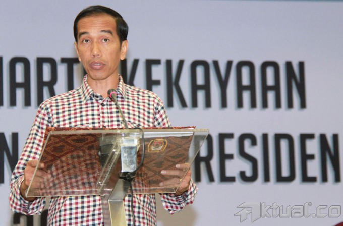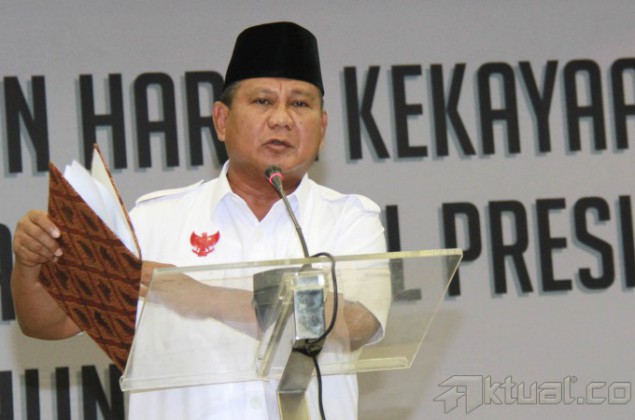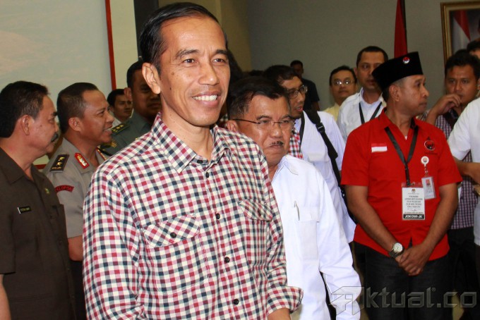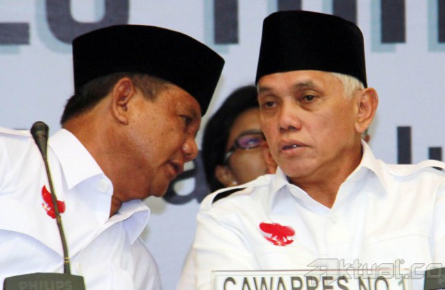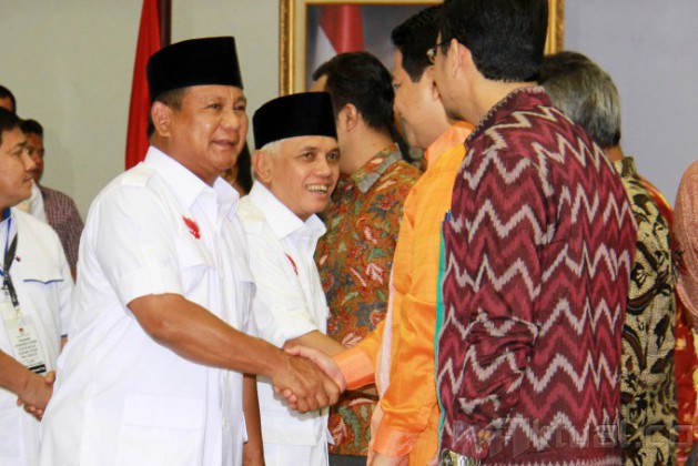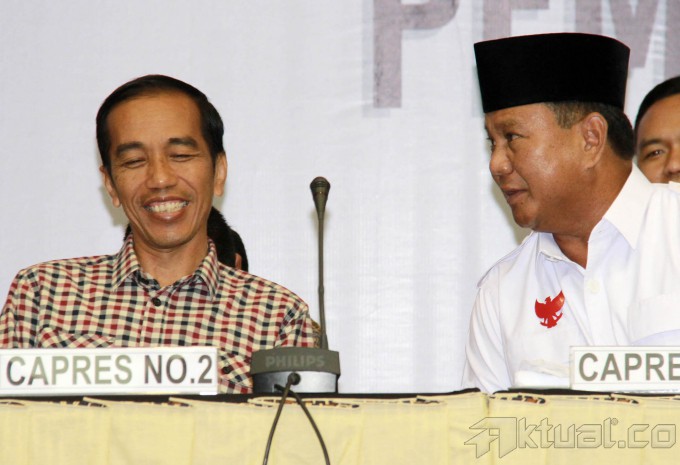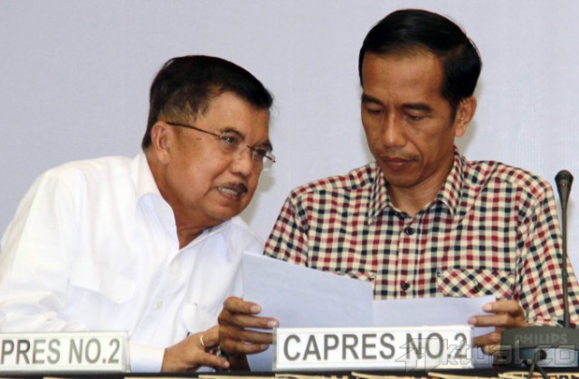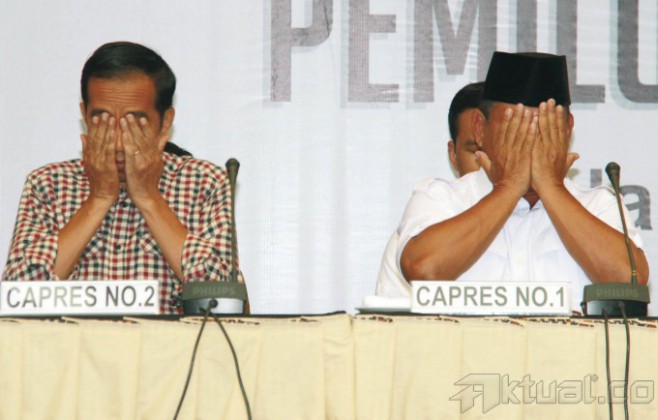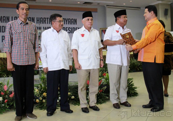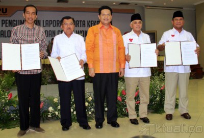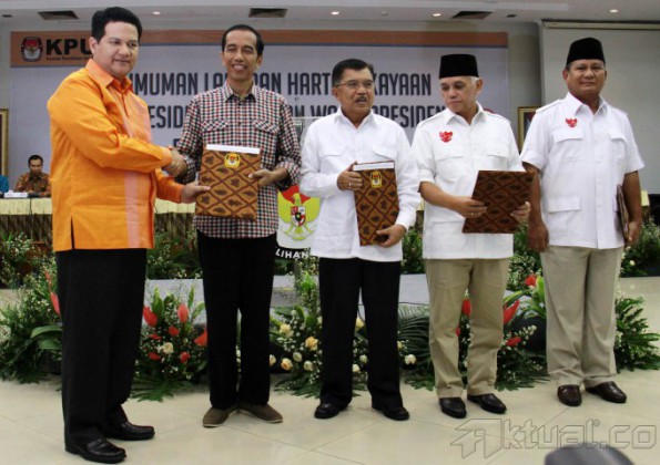 Pasangan calon presiden dan wakil presiden 2014, Prabowo Subianto-Hatta Rajasa dan Joko Widodo-Jusuf Kalla, didampingi Ketua Komisi Pemilihan Umum (KPU) Husni Kamil Manik, memperlihatkan daftar kekayaan saat pengumuman di kantor KPU, Jakarta, Selasa (1/7/2014). Pelaporan kekayaan ini merupakan amanat dan kewajiban bagi para pasangan calon sebagaimana disebutkan dalam pasal 5 UU Nomor 42 tahun 2018 Tentang Pemilihan Umum Presiden dan Wakil Presiden. Aktual/Tino Oktaviano