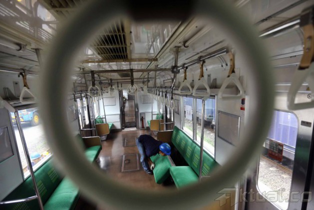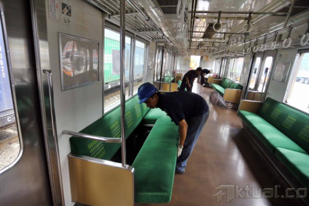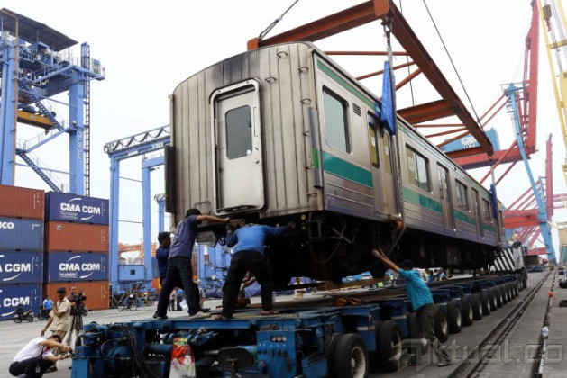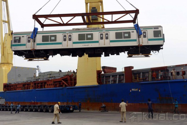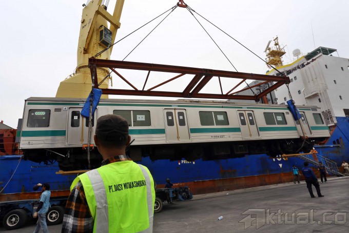 Pekerja menurunkan gerbong KRL dengan menggunakan alat berat ke bantalan rel di Stasiun Pasoso, Pelabuhan Tanjung Priok, Jakarta, Senin (4/11/2013). Sebanyak 30 unit KRL (Kereta Rel Listrik) yang didatangkan dari Jepang ini akan melengkapi 180 unit KRL yang direncanakan tiba pada akhir tahun 2013 untuk menunjang kenaikan jumlah penumpang KRL akibat penetapan tarif progresif. Aktual/Tino Oktaviano