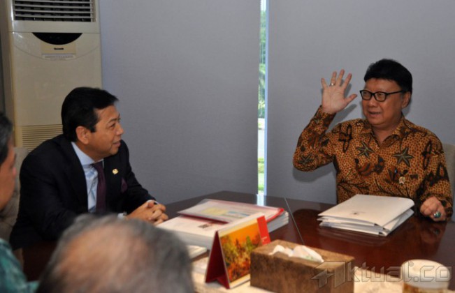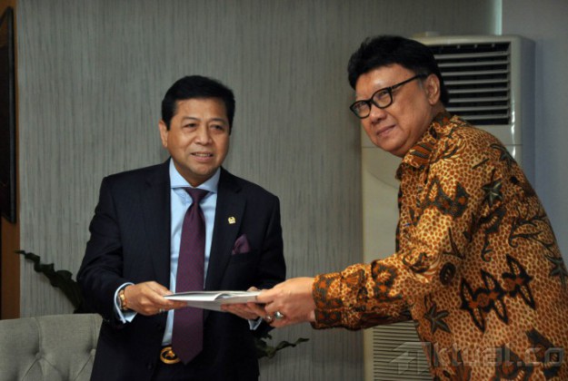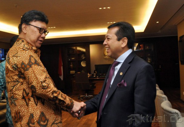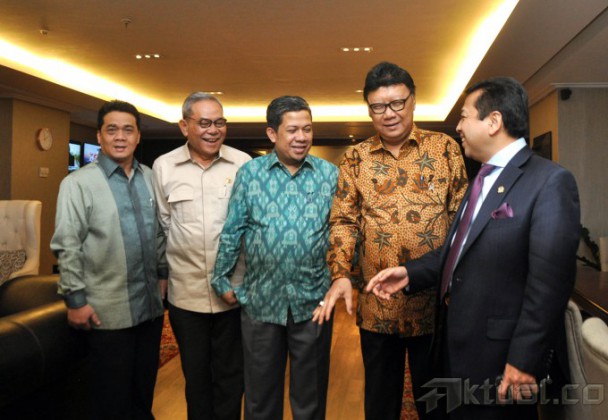 Ketua DPR Setya Novanto (kanan) menerima Mendagri tjahjo kumolo (kedua kanan) disaksikan dari kiri Wakil Ketua Komisi II DPR RI Ahmad Riza Patria, Ketua Komisi II DPR RI Rambey Kamarul Zaman dan Wakil Ketua DPR Fahri Hamzah sebelum melakukan Pertemuan Konsultasi Antara Pimpinan DPR RI didampigi Pimpinan Komisi II dan Menteri Dalam Negeri RI di Ruang Pimpinan DPR, Kompleks Parlemen Senayan, Jakarta Selatan, Senin (11/5/2015). Pertemuan tersebut membicarakan proses pemilihan kepala daerah tahun 2015. AKTUAL/JUNAIDI MAHBUB