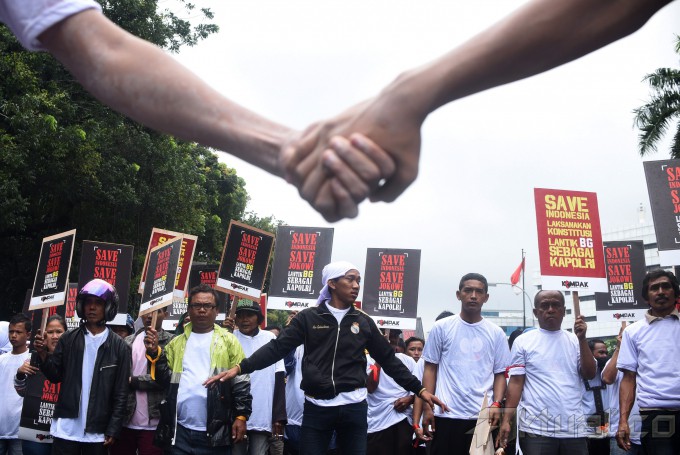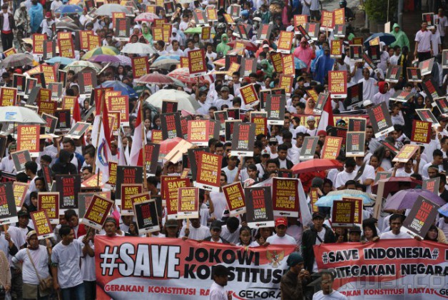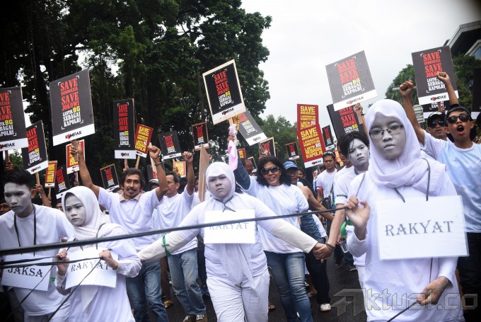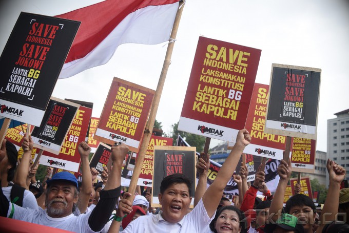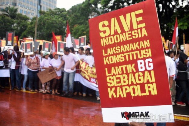 Ratusan simpatisan Koalisi Masyarakat Pengawal Konstitusi (Kompak) melakukan aksi damai dan teaterikal menuju Istana Negara di Jakarta, Rabu (11/2). Aksi tersebut dalam rangka memberikan dukungan kepada Presiden Joko Widodo untuk segera melantik Komjen Pol Budi Gunawan sebagai Kapolri. ANTARA FOTO/M Agung Rajasa