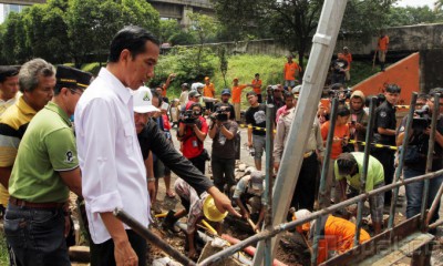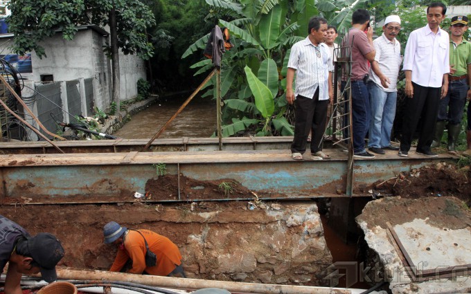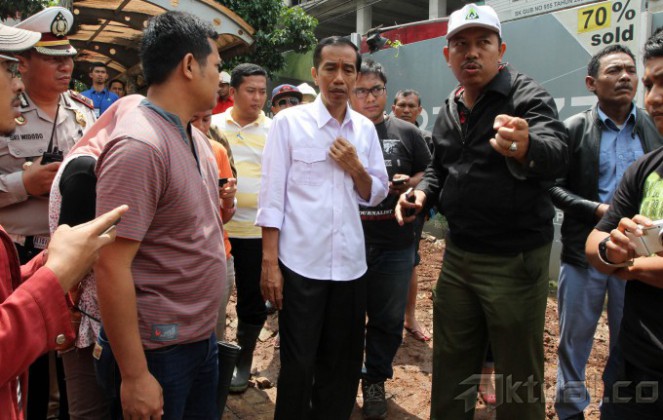 Gubernur DKI Jakarta Joko Widodo (Jokowi) meninjau gorong-gorong yang amblas di Jalan TB Simatupang, Jakarta Selatan, Selasa (14/1/2014). Selain memantau kondisi jalan, Jokowi pun melihat kondisi saluran air dari Gedung Apartemen TB Simatupang tempat air meluap di deretan Gedung Pertamina dan Gedung Perkantoran Oleos. Aktual/Tino Oktaviano
