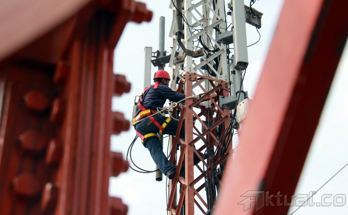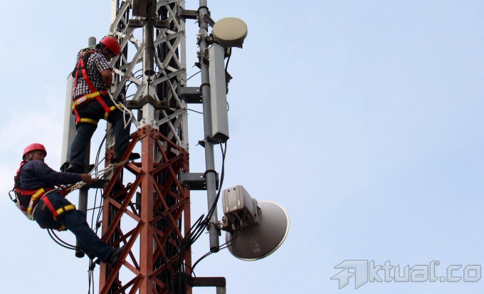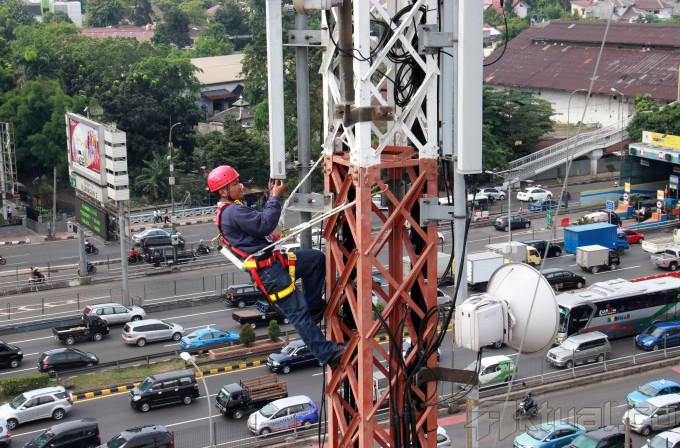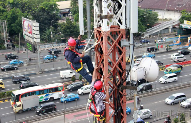 Pekerja PT XL Axiata Tbk mengecek salah satu menara BTS di kawasan Gatot Subroto, Jakarta, Kamis (17/7/2014). XL memastikan kualitas jaringannya semakin kuat dengan jangkauan yang semakin luas dan stabil sebagai hasil dari proses migrasi jaringan dengan Axis. Meski begitu, perseroan menjamin tarif komunikasi dan data akan tetap terjangkau dan lebih murah dibandingkan dengan operator lainnya. Aktual/Tino Oktaviano