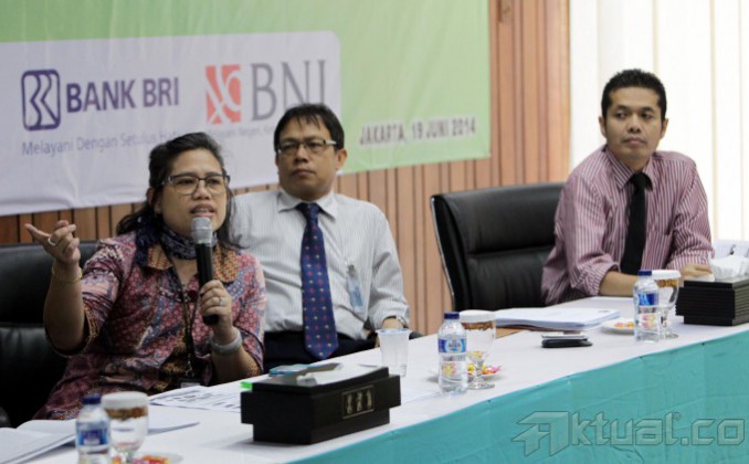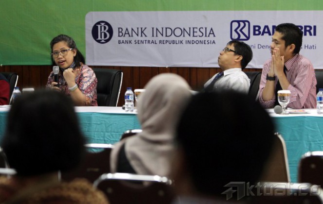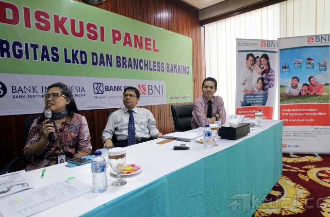 Deputi Direktur Produk Aktivitas dan Anti Pencurian Uang dan Pencegahan Pendanaan Teroris Otoritas Jasa Keuangan (OJK), Ida Rumendang (kiri), Ekonom Bank BNI Ryan Kiryanto (tengah) dan Asisten Direktur Direktorat Pengembangan Akses Keuangan dan UMKM Bank Indonesia, Ricky Satria (kanan), saat menjadi pembicara saat diskusi “Mencari Sinergitas LKD dan Branhless Banking” di Jakarta, Kamis (19/6/2014). OJK menilai budaya menabung dalam masyarakat tetap menjadi kunci utama untuk membuka akses layanan jasa keuangan kepada masyarakat sesuai arah Program Nasional Financial Inclusion. Aktual/Tino Oktaviano