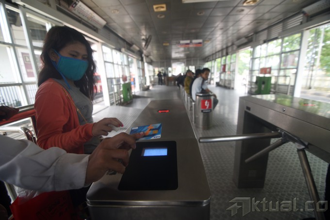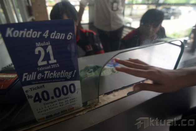 Petugas membantu calon penumpang bus Transjakarta menggunakan e-tiketing di halte Transjakarta Manggarai, Jakarta Selatan, Sabtu (21/2). PT Transportasi Jakarta (Transjakarta) menyatakan seluruh 12 koridor Transjakarta resmi menggunakan e-ticketing. ANTARA FOTO/Zabur Karuru