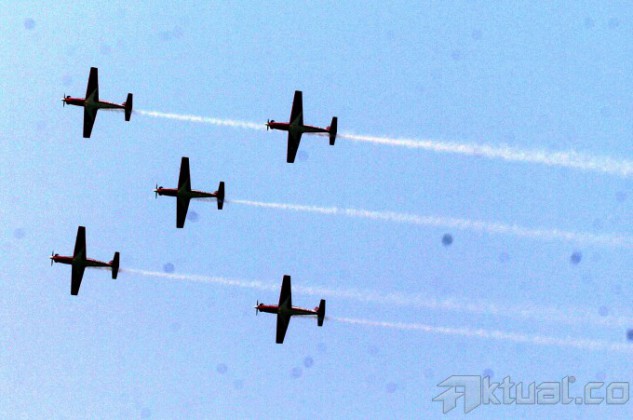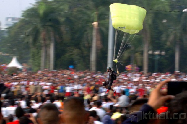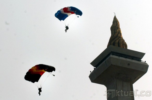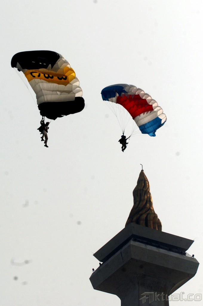 Aksi penerjun payung saat melintas di atas langit di Kawasan Monumen Nasional pada rangkaian acara “Independence Day Run 2014” di Kawasan Silang Monas, Jakarta, Minggu (31/8/2014). Acara tersebut dalam rangka merayakan Hari Ulang Tahun Kemerdekaan Republik Indonesia ke-69 yang dihadiri Presiden RI Susilo Bambang Yudhoyono. Aktual/Tino Oktaviano