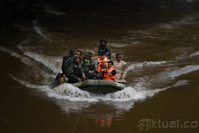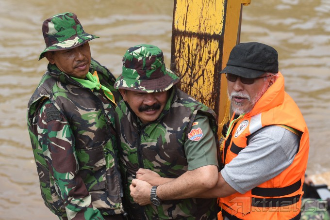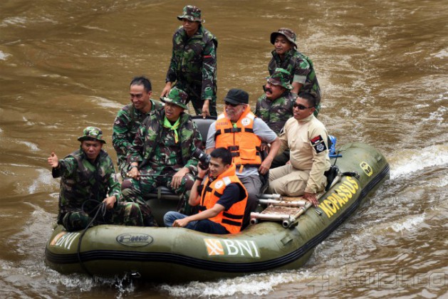 Pangdam Jaya Mayjen TNI Agus Sutomo (kedua kiri) bersama musisi Iwan Fals (kedua kanan) dan sejumlah prajurit TNI AD berada di perahu karet menyusuri kali Ciliwung di Manggarai, Jakarta Selatan, Sabtu (21/2). Aksi menyusuri Ciliwung sambil membersihkan sampah di kali tersebut dalam rangka Hari Peduli Sampah Nasional. ANTARA FOTO/Zabur Karuru