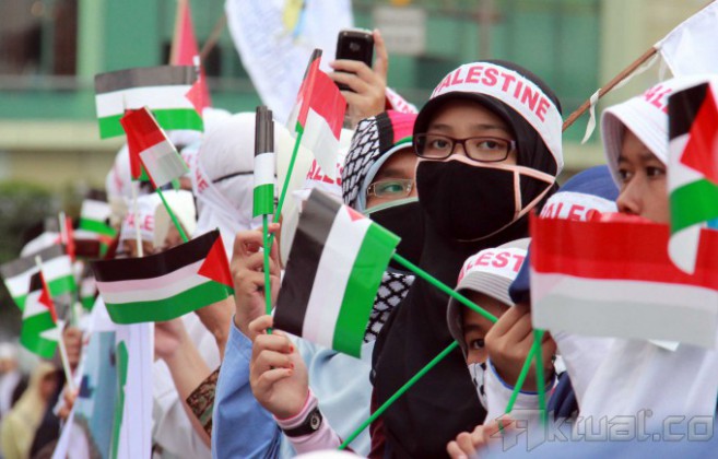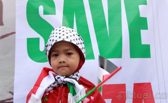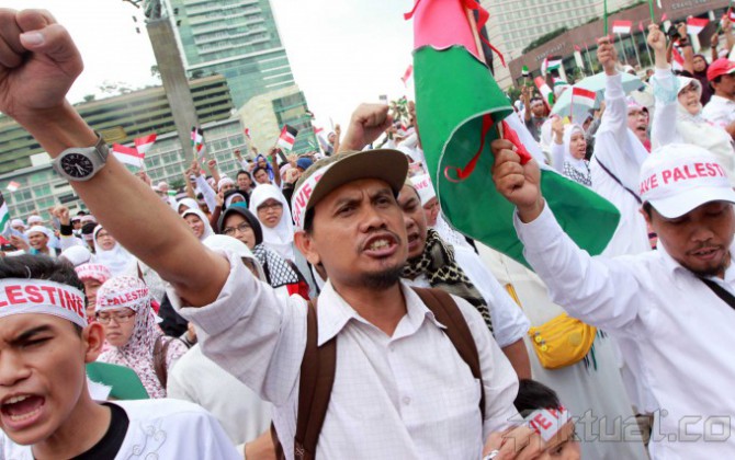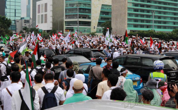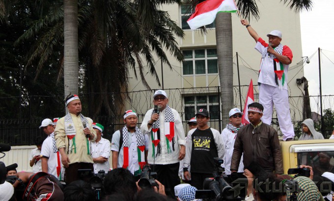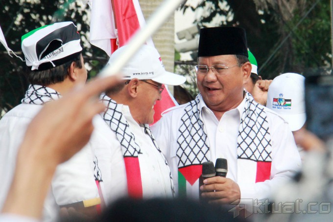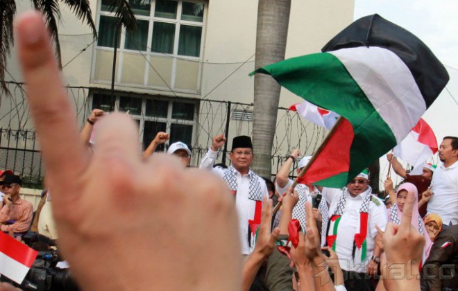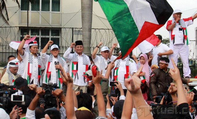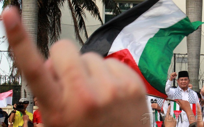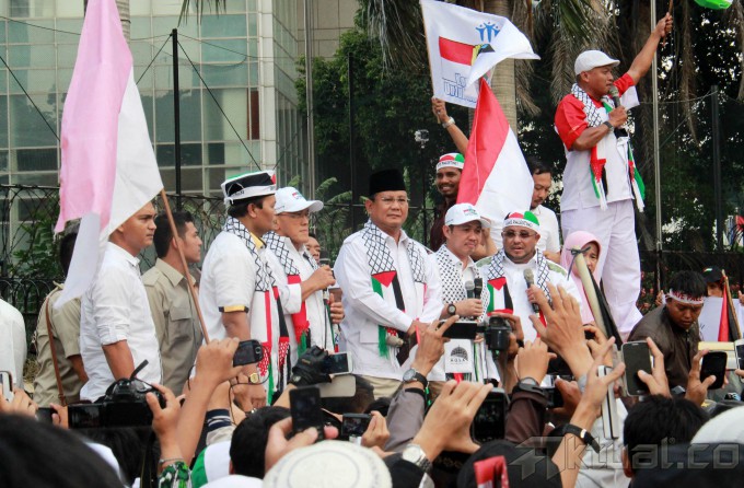 Capres Prabowo Subianto, saat berorasi mengutuk serangan Israel ke Palestina bersama masyarakat Indonesia di Bundaran Hotel Indonesia, Jakarta, Jumat (11/7/2014). Dalam orasinya Prabowo mengutuk serangan Israel dan akan menyumbang Rp 1 miliar untuk Palestina. Aktual/Tino Oktaviano
