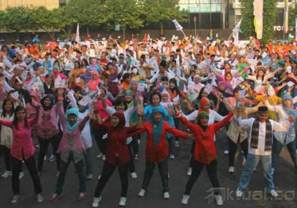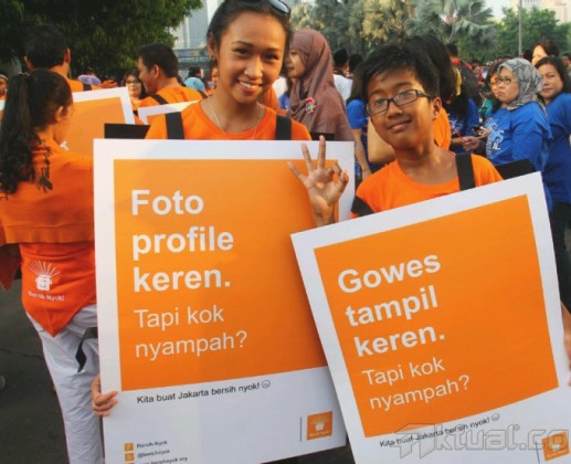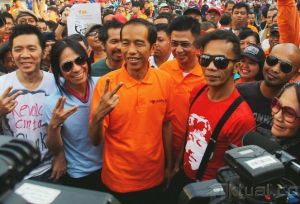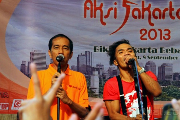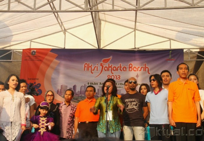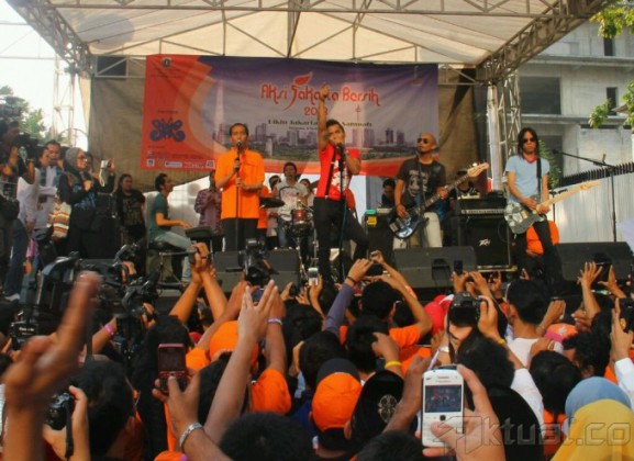 Gubernur DKI Jakarta Joko Widodo bernyanyi bersama Group band Slank saat membuka acara aksi Jakarta Bersih, di Jalan Thamrin, Jakarta, Minggu (8/8). Aksi ini dilakukan untuk menyadarkan masyarakat Jakarta untuk tidak membuang sampah sembarangan. Aktual/Oke Dwi Atmaja
