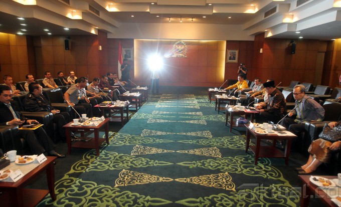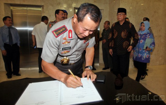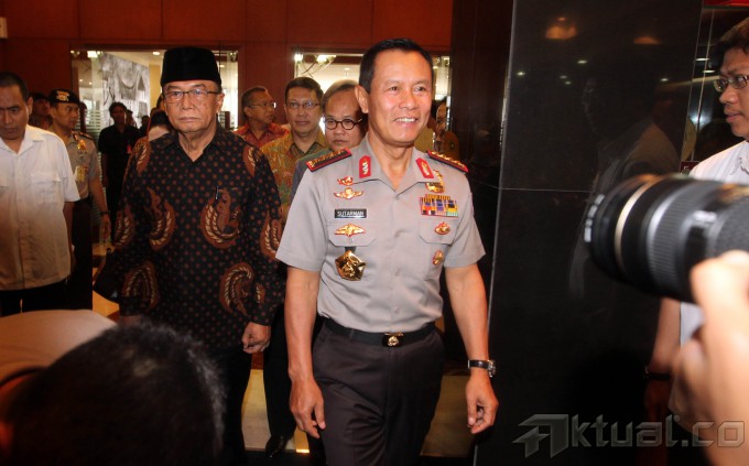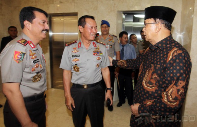 Ketua MPR Sidarto Danusubroto (kanan) berbincang dengan Kapolri Jenderal (Pol) Sutarman (tengah) usai menggelar pertemuan tertutup di Kompleks Parlemen Senayan, Jakarta, Selasa (25/2/2014). Pertemuan tersebut membahas berbagai penanganan Polri terhadap tindak kejahatan teror yang dilakukan oleh teroris. Aktual/Tino Oktaviano