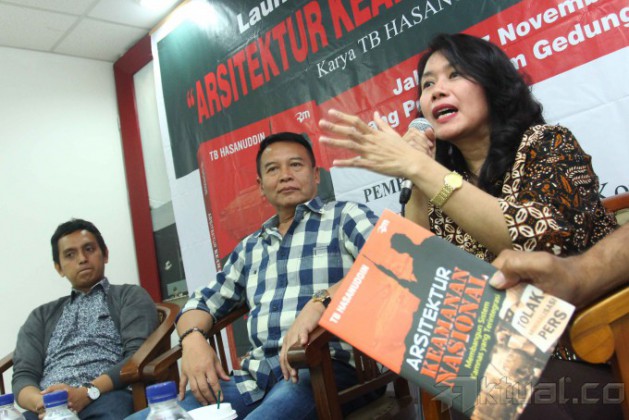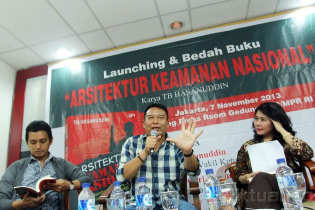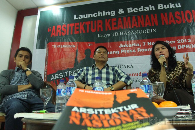 Wakil Ketua Komisi I Fraksi PDIP yang juga Penulis Buku Mayjen (Purn) TB Hasanuddin (tengah) bersama Pengamat Militer dan Pertahanan LIPI Jaleswari Pramodawardani (kanan) dan Direktur Program Imparsial Al-Araf menyampaikan pendapatnya saat diskusi dan peluncuran Buku “Arsitektur Keamanan Nasional, Membangun Sistem Keamanan Nasional Terintegrasi” di Gedung Parlemen, Jakarta, Kamis (7/11/2013). Buku Karya Mayjen (Purn) TB Hasanudin ini secara komprehensif mengulas bangunan konsep sistem Keamanan Nasional yang lengkap dan terintegrasi di tengah ancaman pengawasan 60.000 Spionase yang bertebaran di Indonesia. Aktual/Tino Oktaviano