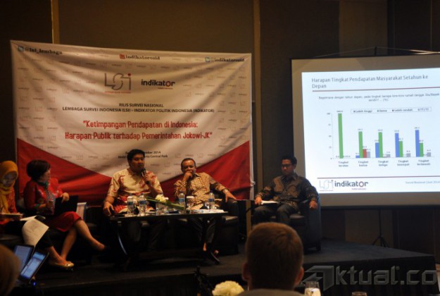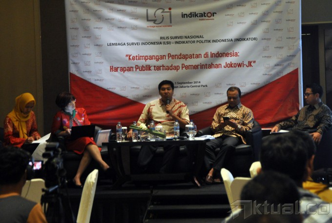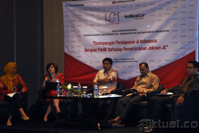 Dari kiri ke kanan, Ekonom Indef, Aviliani, Ketua DPP PDI Perjuangan Maruarar Sirait, Direktul Eksekutif LSI, Kusridho Ambardi, Staff Khusus Presiden bidang Ekonomi, Firmanzah saat menjadi pembicara pada acara diskusi di Hotel Pillman, Jakarta, Senin (1/9/2104). Diskusi tersebut bertema “Ketimpangan Pendapatan di Indonesia : Harapan Publik Terhadap Pemerintahan Jokowi-Jusuf Kalla. Aktual/Junaidi Mahbub