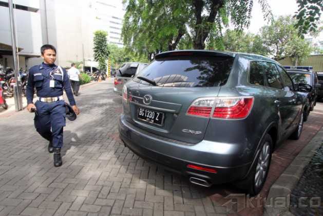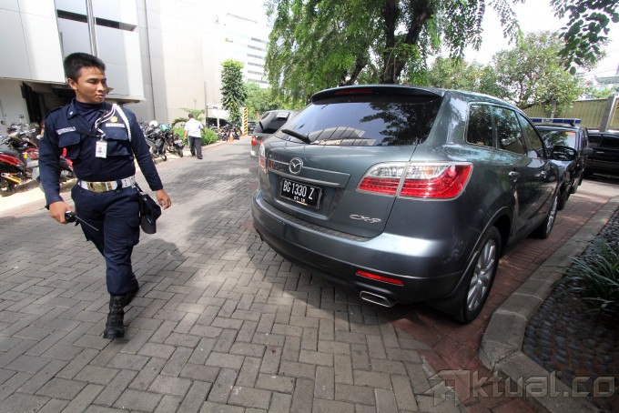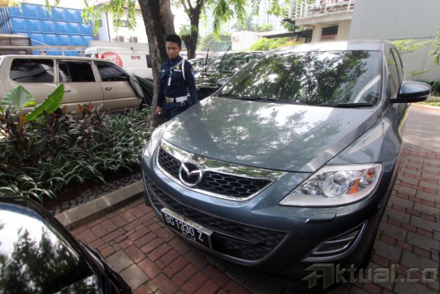 Petugas keamanan melintas mobil Mazda CX-9 no polisi BG 1330 Z milik mantan Ketua Mahkamah Konstitusi (MK) Akil Mochtar yang disita Komisi Pemberantasan Korupsi (KPK) di halaman parkir gedung KPK, Jakarta, Kamis (21/11/2013). Jadi total kendaraan Akil yang disita KPK menjadi 4 buah, yang sebelumnya yaitu Mercedes Benz S 350, Audi Q5, dan Toyota Crown Athlete. Aktual/Tino Oktaviano