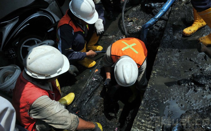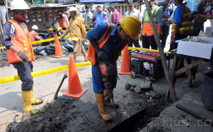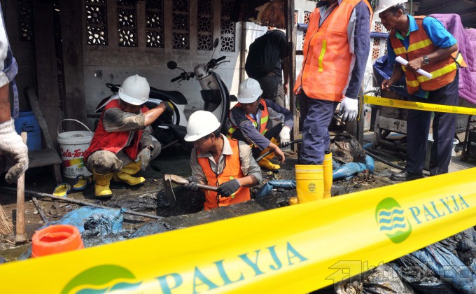 Petugas Palyja merazia pipa ilegal bersama mitra kerja PAM Jaya di pemukiman kawasan Muara Angke, Jakarta Utara, Rabu (4/6/2014). Dalam razianya petugas Palyja menemukan pemakaian air secara ilegal dengan menggunakan 5 pipa ilegal sepanjang 500 meter dan pompa besar untuk menarik air tersebut. Aktual/Tino Oktaviano