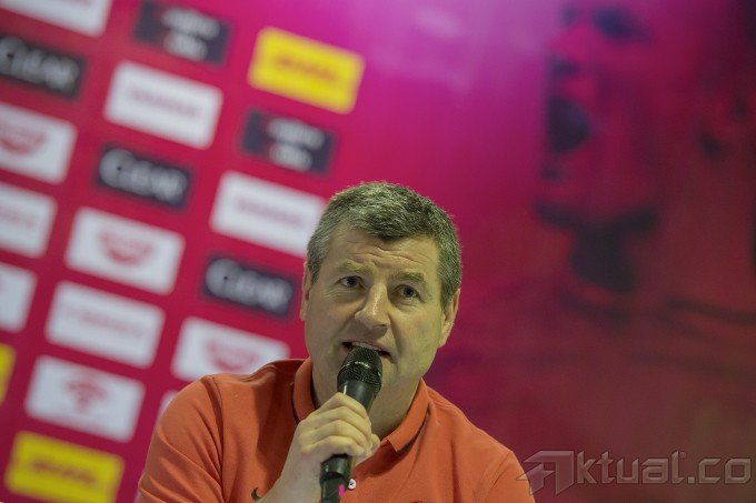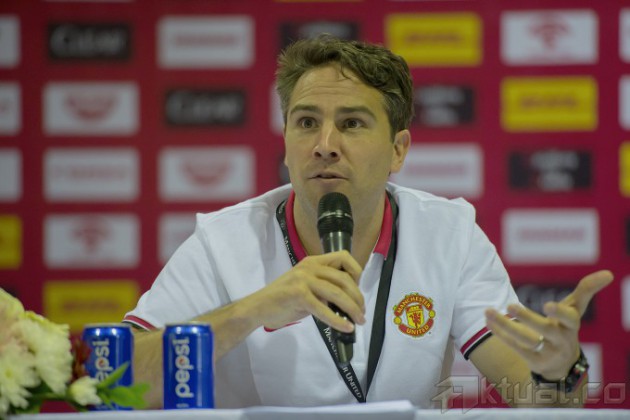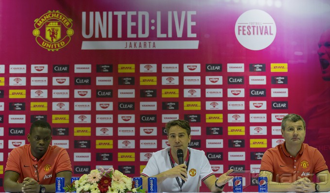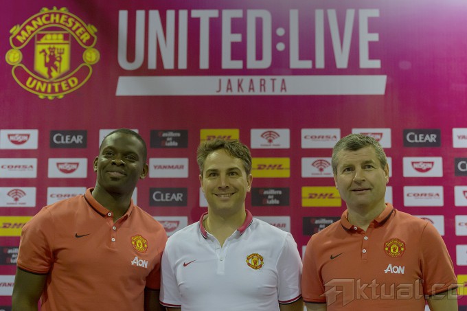 Managing Director Asia Pacific Manchester United (MU) Jamie Reigle (tengah) berfoto bersama dengan dua pemain legendaris MU, Denis Irwin (kanan) dan Louis Saha (kiri) usai memberikan keterangan pers tentang United: Live in Jakarta di Balai Kartini, Jakarta, Sabtu (31/1). Football Festival khusus satu hari tersebut diisi dengan berbagai atraksi seperti panggung musik, Sekolah Sepak Bola Manchester United, gerai penjualan cenderamata MU, temu pemain legenda klub MU dengan pendukungnya yang diakhiri dengan nonton bareng penayangan langsung pertandingan MU vs Leicester City. ANTARA FOTO/Widodo S. Jusuf