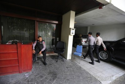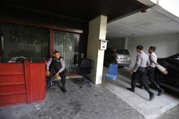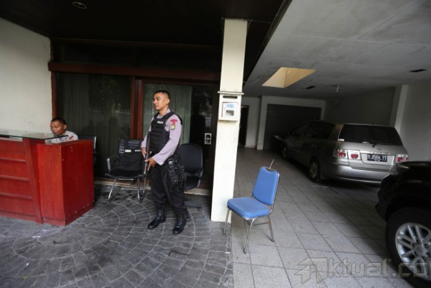 Polisi melakukan penjagaan di kantor Saiful Mujani Research and Consulting (SMRC) di Jl Kusuma Atmaja, Menteng, Jakarta Pusat, Jumat (11/7/2014). Hal ini terkait informasi massa yang akan mendemo kantor penyelenggara hitung cepat yang hasil perhitungannya menunjukkan keunggulan Jokowi-JK ini. Aktual/Tino Oktaviano