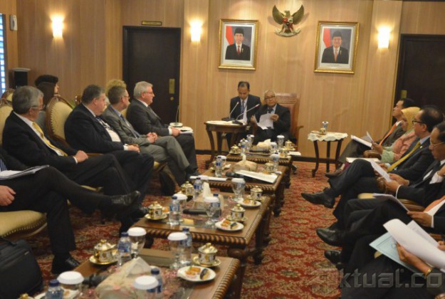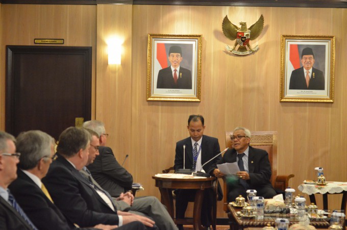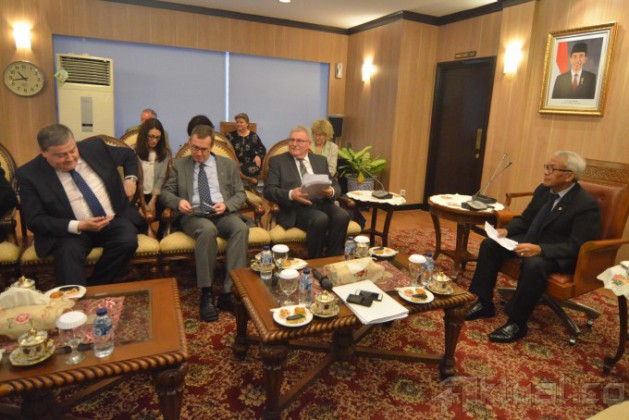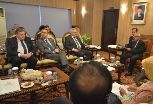 Wakil Ketua DPR Agus Hermanto (kanan) didampingi Anggota Komisi I Menerima Delegasi Parlemen Eropa yang dipimpin oleh Chairman Delegation of the European Parliament for South East Asia and ASEAN Werner Langen (kedua dari kanan) pada pertemuan di Kompleks Parlemen Senayan, Jakarta Selatan, Selasa (16/3/2015). Pertemuan tersebut membahas kerja sama Indonesia dengan negara-negara Eropa. AKTUAL/JUNAIDI MAHBUB