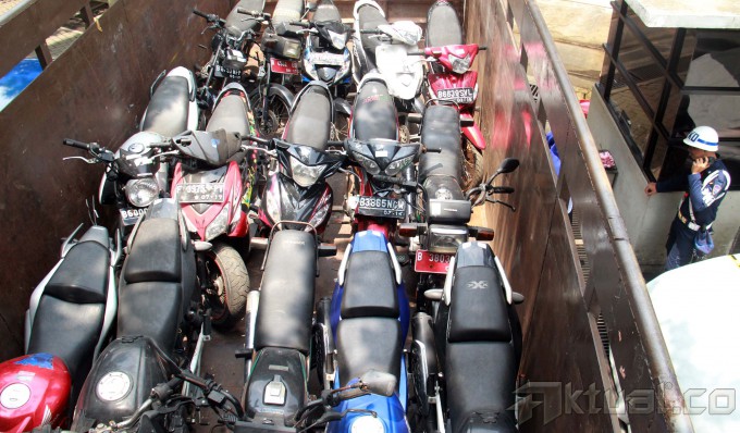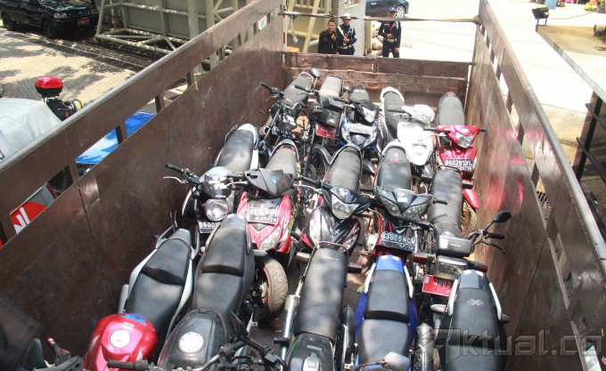 Sebuah truk mengangkut 31 sepeda motor milik mantan Ketua MK Akil Mochtar yang disita Komisi Pemberantasan Korupsi (KPK), di gedung KPK, Jakarta, Senin (17/2/2014). Puluhan motor tersebut dipindahkan karena halaman parkir KPK sudah tidak muat, dan langsung dipindahkan ke gudang milik PT KAI di Manggarai, Jakarta Selatan. Aktual/Tino Oktaviano