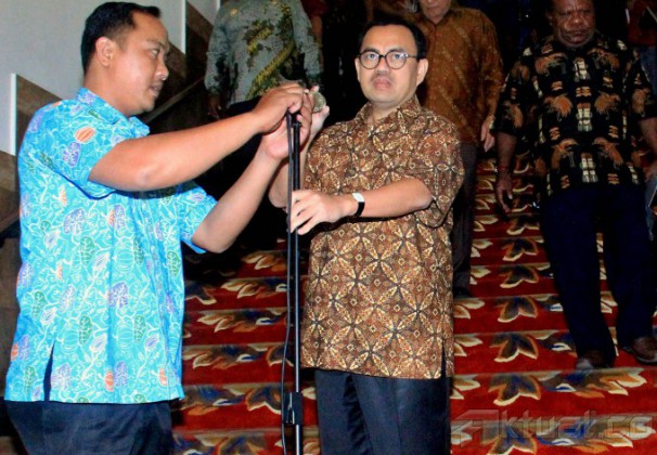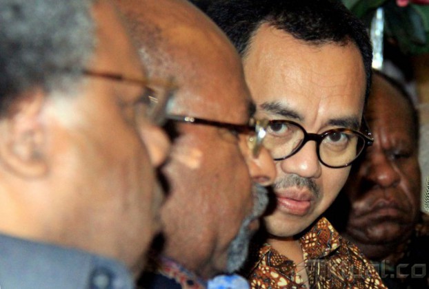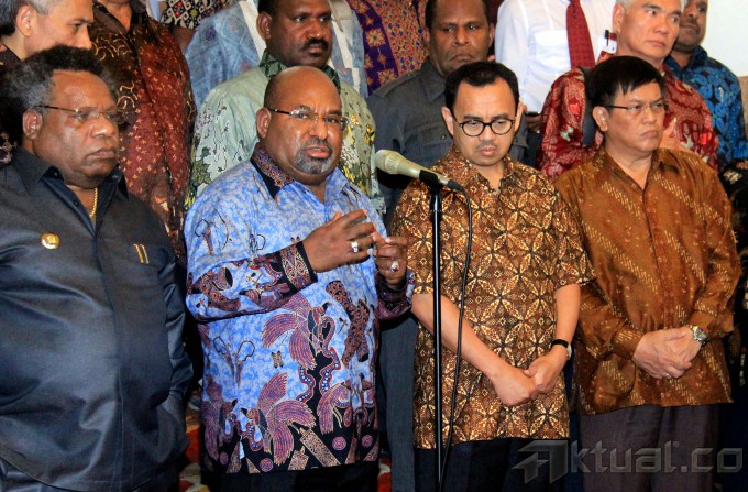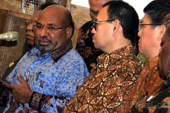 Menteri ESDM Sudirman Said (kedua kanan) didampingi Gubernur Papua Lukas Enembe (kedua kiri), saat memngumunkan rencana pembangunan smelter usai pertemuan di Kantor Kementrian ESDM, Jalan Merdeka Selatan, Jakarta Pusat, Jumat (6/2/2015). Pertemuan tersebut membahas permasalahan pembangunan pabrik pengolahan dan pemurnian (smelter) oleh PT Freeport Indonesia. AKTUAL/MUNZIR