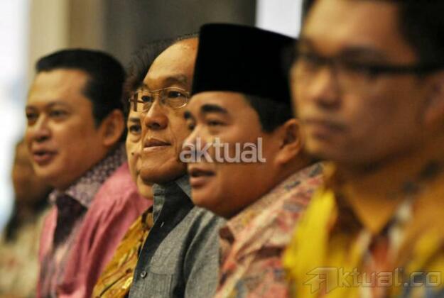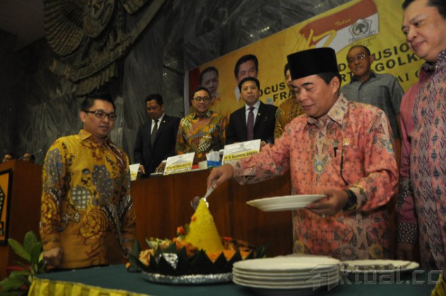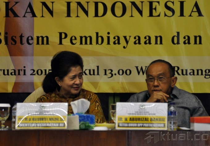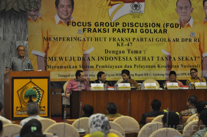 Ketua Umum Partai Golkar Aburizal Bakrie (tengah) bersama Menteri Kesehatan Nila Moeloek (kedua kiri), Ketua Fraksi Golkar Ade Komarudin (kedua kanan), Sekertaris Fraksi Golkar Bambang Soesatyo (kiri) dan Ketua Pelaksana Aditya Anugrah Moha, mengikuti Forum Group Discusion (FGD) Partai Golkar di Jakarta, Selasa (17/2). Kegiatan yang berlangsung dalam rangka memperingati HUT Partai Golkar ke-47 tersebut mengambil tema “mewujudkan Indonesia sehat tanpa sekat”. AKTUAL/JUNAIDI MAHBUB