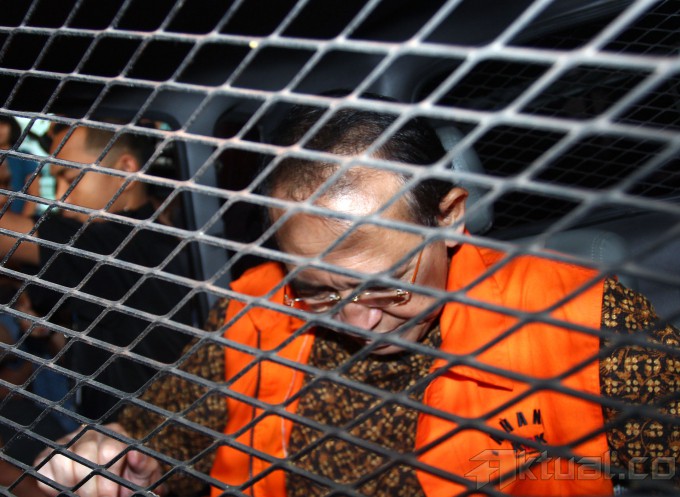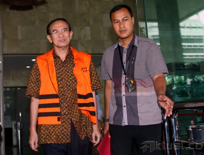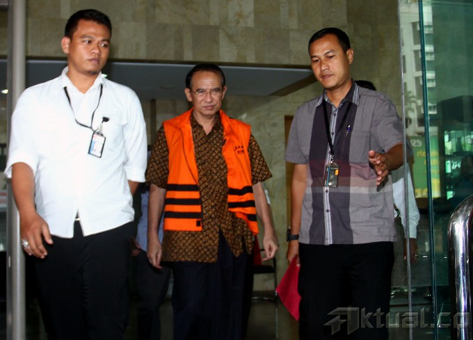 Mantan Menteri Agama Suryadharma Ali (SDA), dikawal menuju keluar usai menjalani pemeriksaan di gedung KPK, Jakarta, Selasa (21/4/2015). SDA diperiksa sebagai tersangka dalam kasus dugaan korupsi dalam penyelenggaraan ibadah haji tahun 2012-2013. AKTUAL/MUNZIR