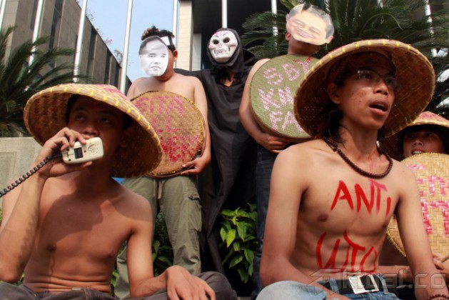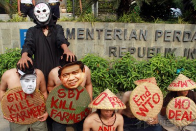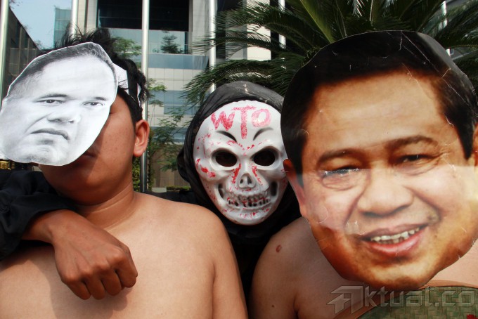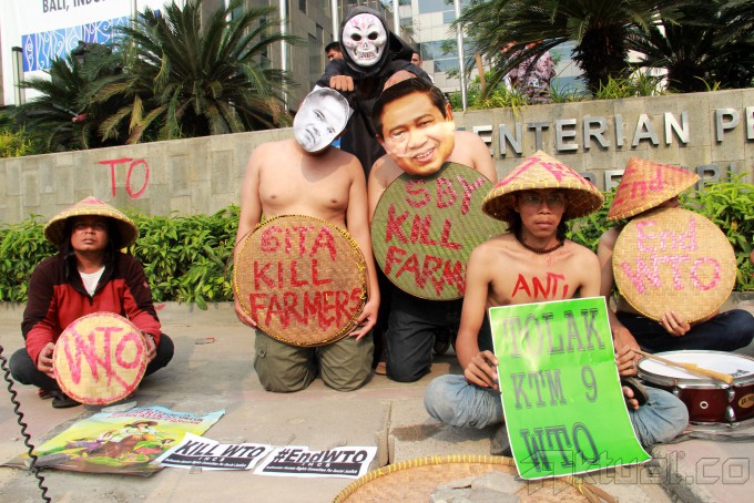 Sejumlah aktivis yang tergabung dalam jaringan Koalisi Anti Utang menggelar aksi teatrikal anti Organisasi Perdagangan Dunia (WTO) di depan gedung Kementrian Perdagangan, Jakarta, Jumat (6/12/2013). Dalam aksinya mereka menyerukan penolakan terhadap perjanjian dalam WTO yang hanya menguntungkan negara industri. Aktual/Tino Oktaviano