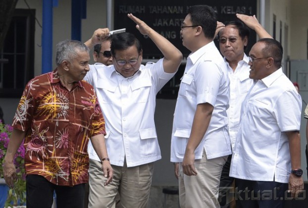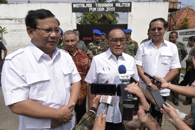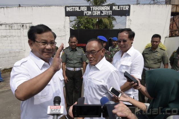 Para petinggi Koalisi Merah Putih (KMP) Amien Rais (kiri), Prabowo Subianto (tengah), Aburizal Bakrie (kedua kanan) dan Djan Faridz (kanan) meninggalkan rutan Guntur usai menjenguk mantan Menteri Agama Suryadharma Ali di Jakarta, Kamis (4/6). Kedatangan petinggi KMP tersebut untuk memberikan dukungan moral terhadap Suryadharma yang ditahan atas kasus dugaan korupsi penyelenggaraan ibadah haji 2012-2013. ANTARA FOTO/Sigid Kurniawan